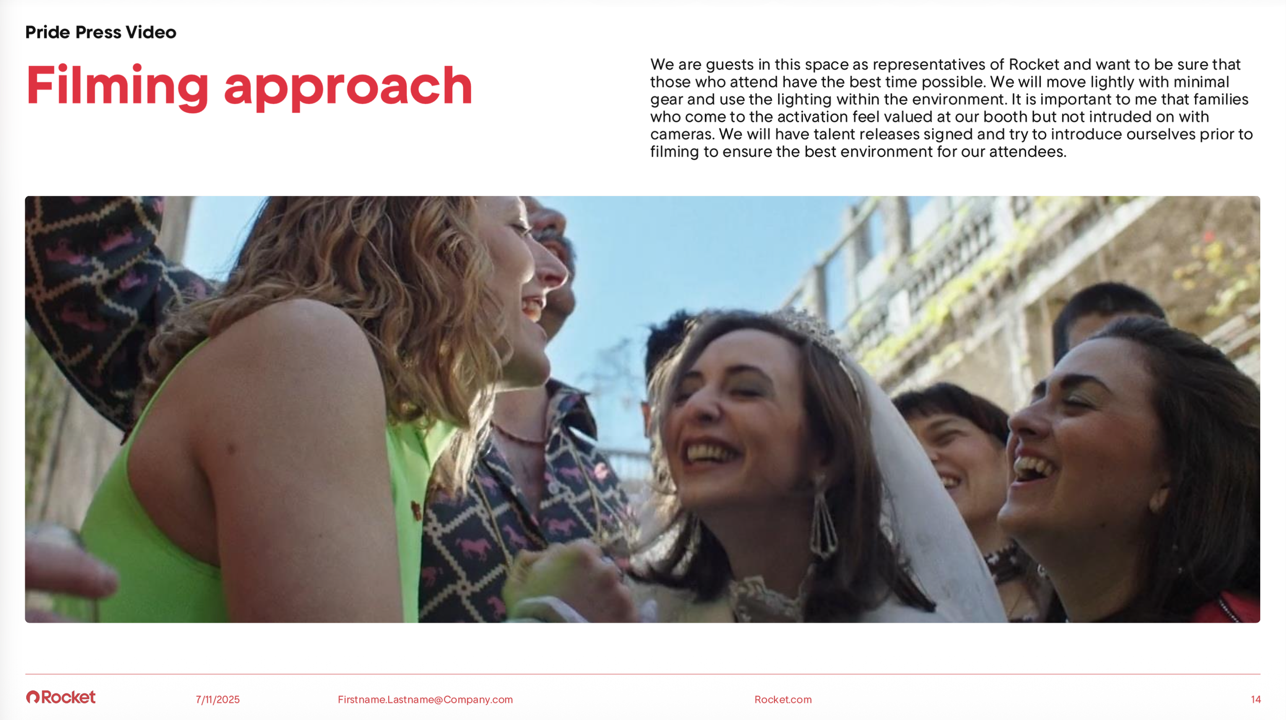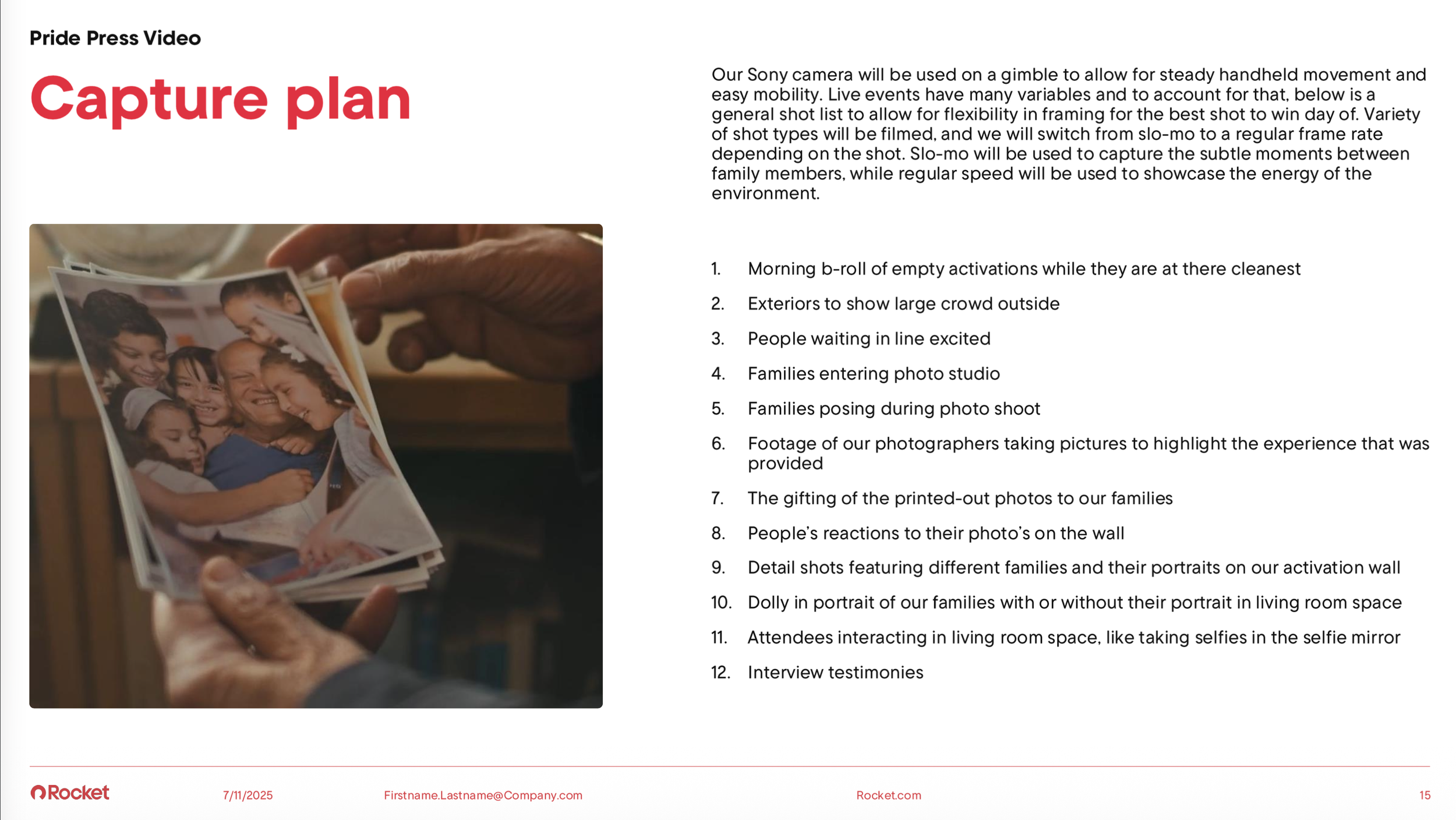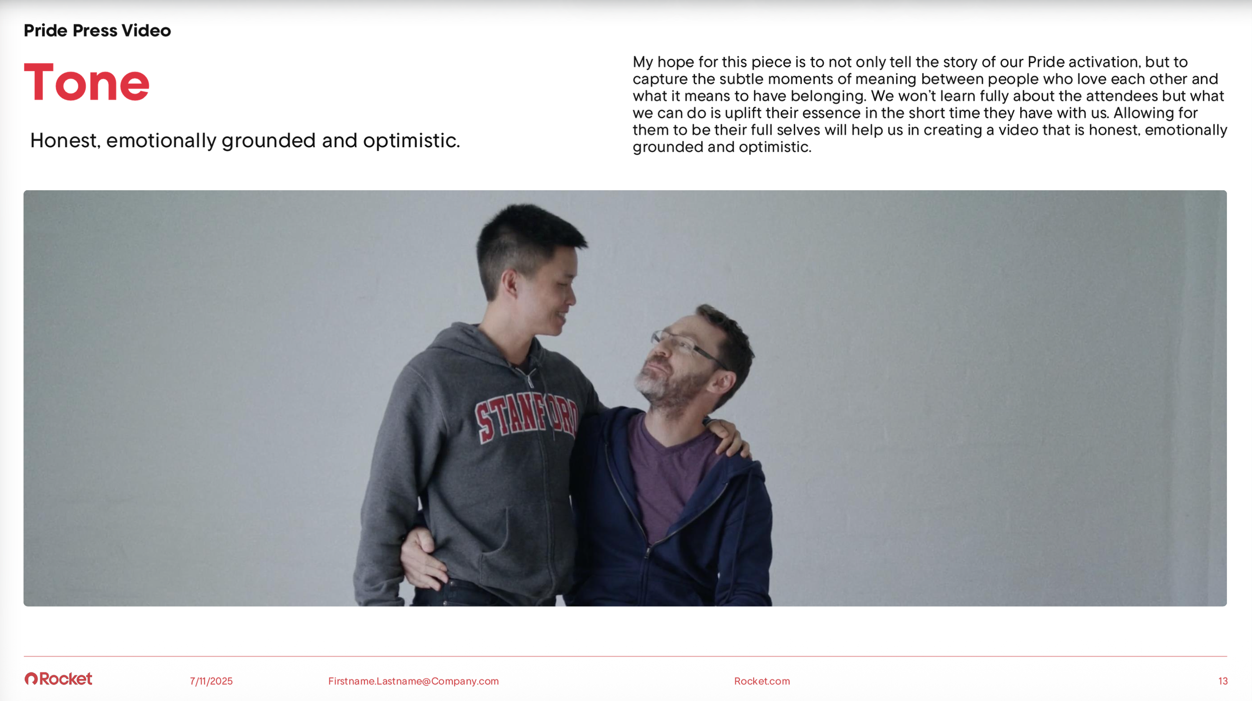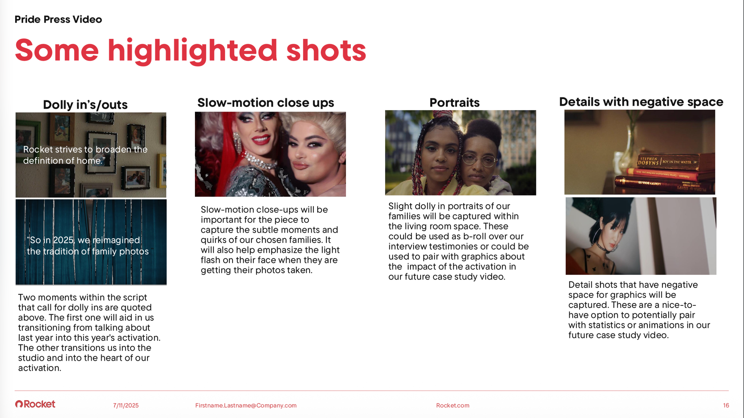 Sam note: “This project had a quick turnaround so figuring out story structure prior to the event, having storyboards and pre selecting music was vital. It was not your typical event coverage. Identifying moments such as the pan into the photo studio for a reveal, understanding how short and impactful the testimonies needed to be and making sure we got diverse representation was prioritized. My hope for this piece was to not only tell the story of our Pride activation, but to capture the subtle moments of meaning between people who love each other and what it means to have belonging. We didn’t learn fully about the attendees but what we could do is uplift their essence in the short time they had with us. Allowing for them to be their full selves helped us in creating a video that was honest, emotionally grounded and optimistic.”